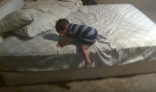Aquest nen està molt incòmode damunt el llit dels seus pares i l’única cosa que vol és baixar-ne, però sense fer-se mal. Per això planeja una estratègia…tirar els coixins al terra per després baixar còmodament. Què us sembla?