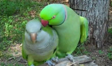 Aquí teniu un joc de seducció molt graciós entre un mascle de cotorra de Kramer, originari de la Índia, i una cotorreta de pit gris. Sense cap tipus de vergonya i d’una manera molt afectuosa, el mascle li demana un